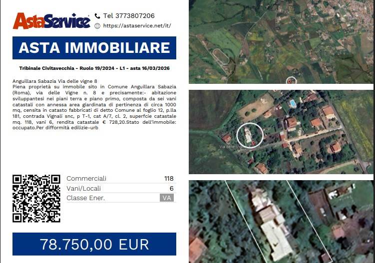 Piena proprietà su immobile sito in Comune Anguillara Sabazia (Roma), via delle Vigne n. 8 e precisamente:- abitazione sviluppantesi nei piani terra e piano primo, composta da sei vani catastali con annessa area giardinata di pertinenza di circa 1000 mq, censita in catasto fabbricati di detto Comune al foglio 12, p.lla 181, contrada Vignali snc, p T-1, cat A/7, cl. 2, superfcie catastale mq. 118, vani 6, rendita catastale € 728,20.Stato dell’immobile: occupato.Per difformità edilizie-urb
