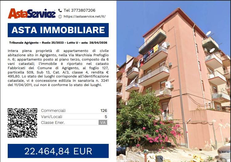 Intera piena proprietà di appartamento di civile abitazione sito in Agrigento, nella Via Marchisia Prefoglio n. 6; appartamento posto al piano terzo, composto da 6 vani catastali; l’immobile è riportato nel catasto Fabbricati del Comune di Agrigento, al foglio 127, particella 509, Sub 13, Cat. A/3, classe 4, rendita € 495,80. Lo stato dei luoghi corrisponde all’identificazione catastale, vi è concessione edilizia in sanatoria n. 3241 del 11/04/2011, cui non è conforme lo stato dei luoghi.