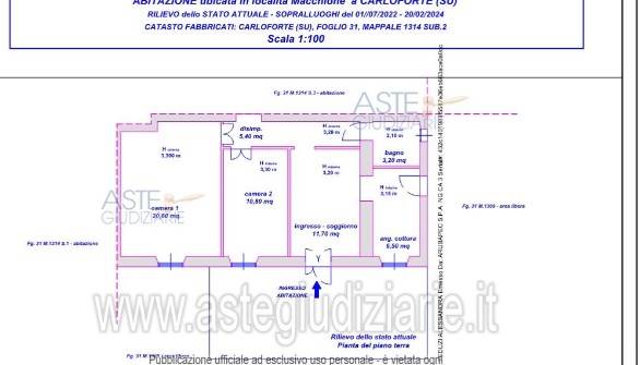L’immobile consta di un ambiente d’ingresso, pranzo e soggiorno, da cui si accede a una cucina e a un disimpegno, su cui si aprono un bagno e due camere da letto.