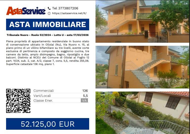 Piena proprietà di appartamento residenziale in buono stato di conservazione ubicato in Ollolai (Nu), Via Nuoro n. 15, al piano primo di un villino bifamiliare su tre livelli, avente corte esclusiva di pertinenza e composto da soggiorno cucina, tre camere da letto, ampio disimpegno, bagno, ripostiglio e due balconi. Distinto al NCEU del Comune di Ollolai al Foglio 12 part. 1034, sub. 2, cat. A/2, classe 7, cons. 5,5, rendita 355,06. Superficie catastale 136 mq, piano 1.