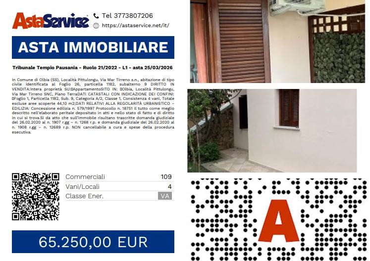 In Comune di Olbia (SS), Località Pittulongu, Via Mar Tirreno s.n., abitazione di tipo civile identificata al Foglio 26, particella 1182, subalterno 9 DIRITTO IN VENDITA:Intera proprietà SU: