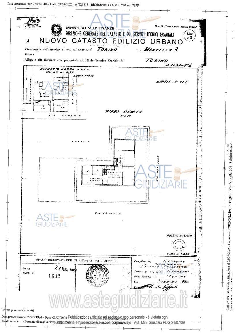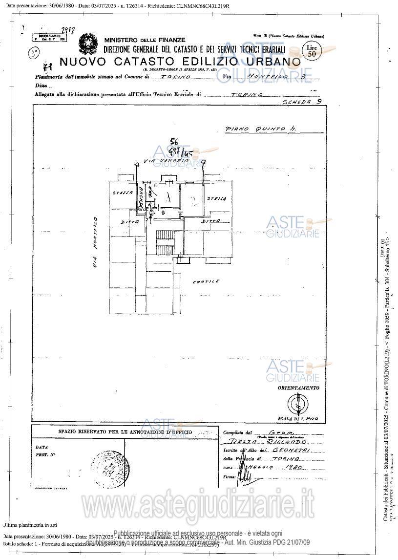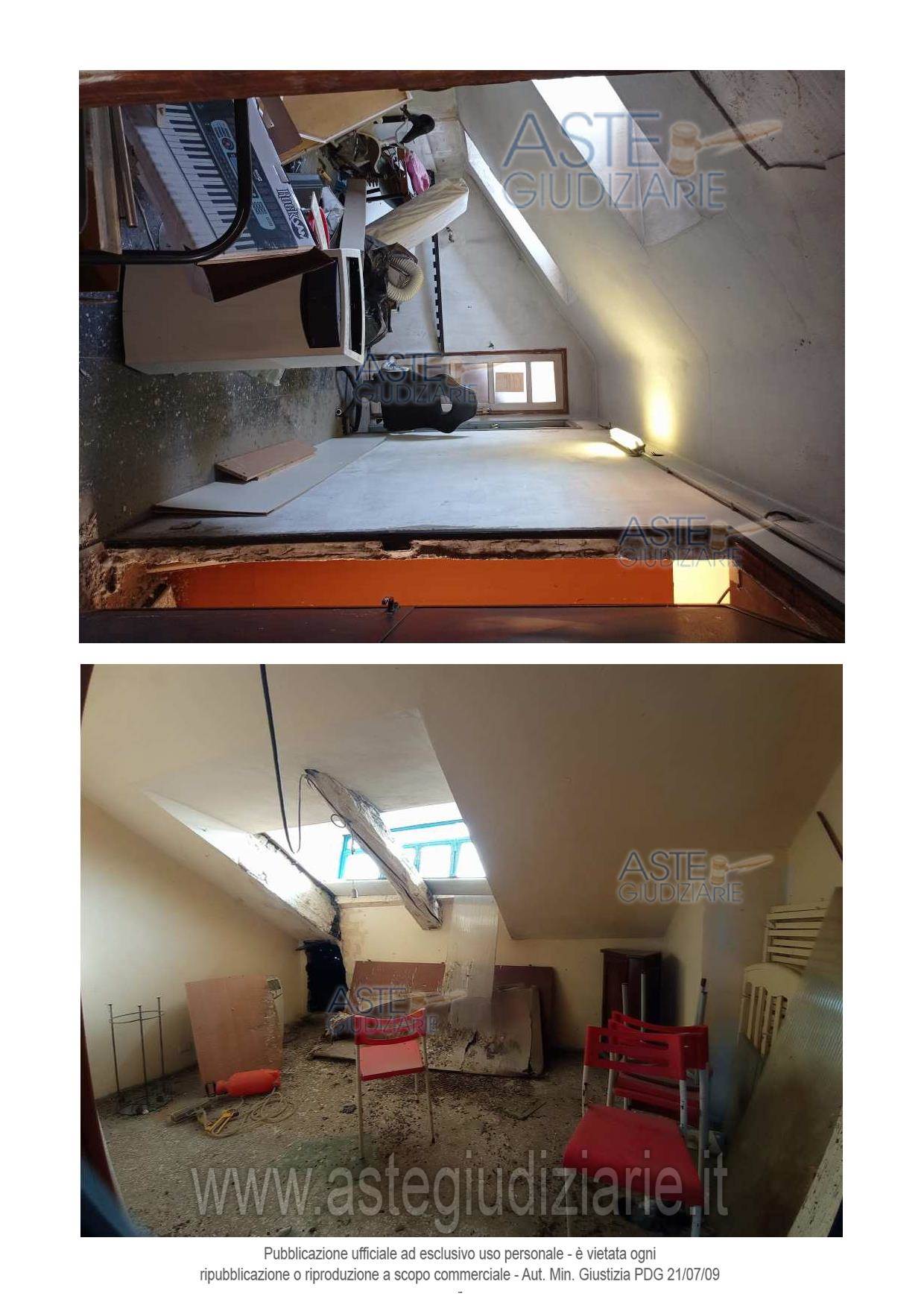 Alloggio al piano quinto (6° f.t.) di stabile senza ascensore, composto da disimpegno, cucina, due camere, bagno con antibagno, e soffitta al piano sottotetto (7° f.t.)